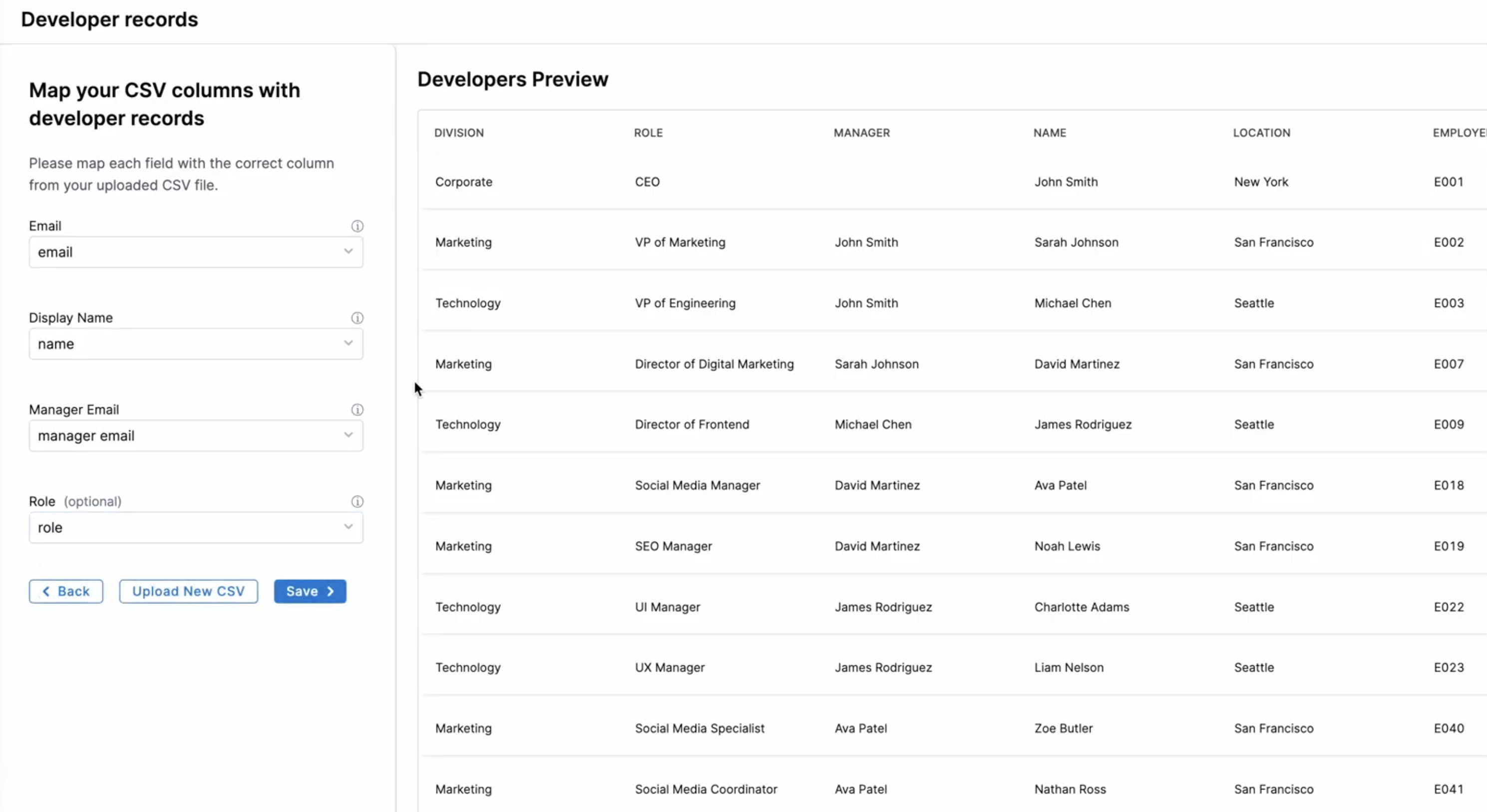On the Developer Preview screen, map the columns from your uploaded CSV to the corresponding SEI fields:  - Display Name: Select the column containing the developer's name.
