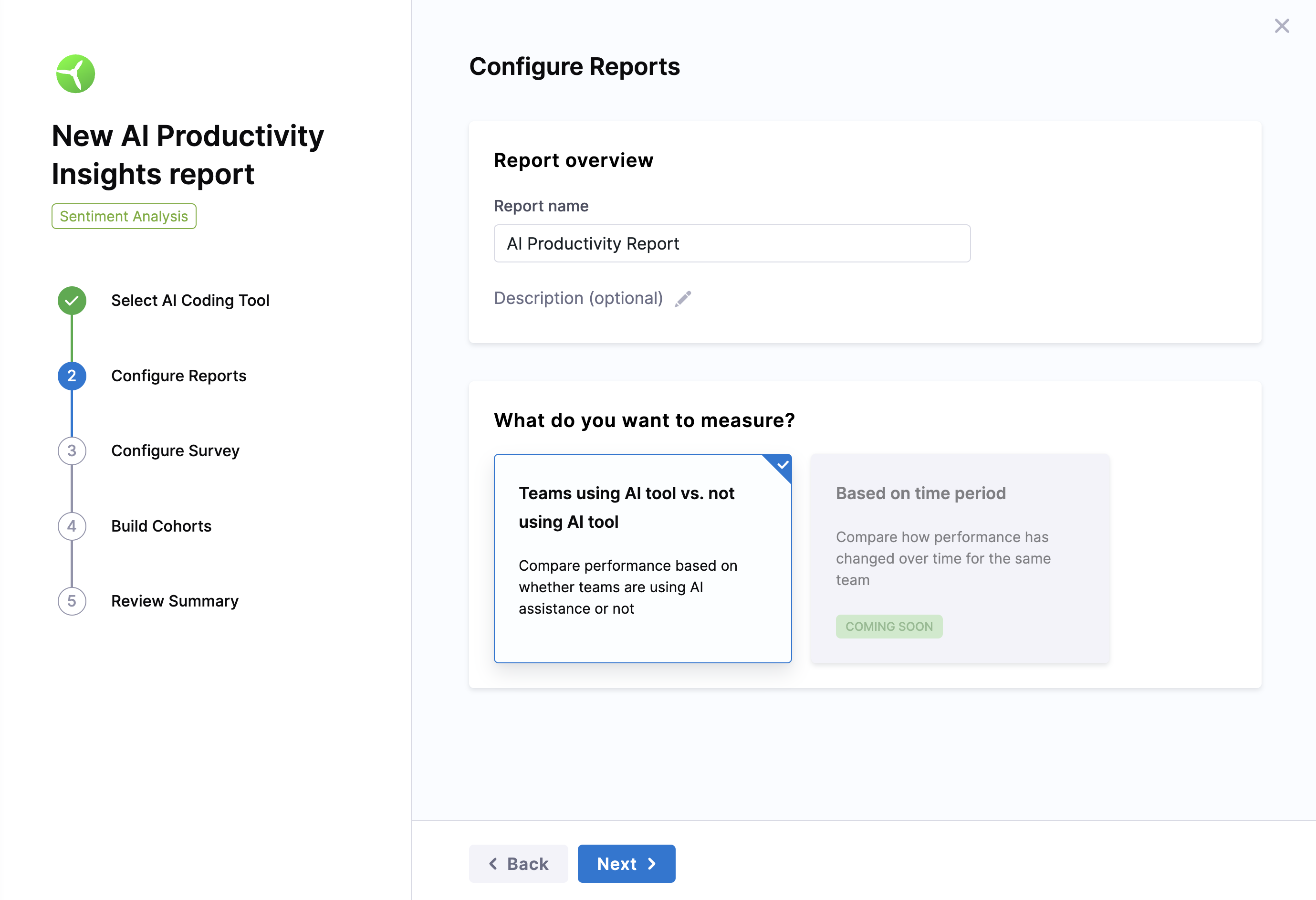 • Note that the support for assessing how the performance of the same team changes over a specified time period, such as before and after implementing an AI tool is currently not available but will be added in the future.