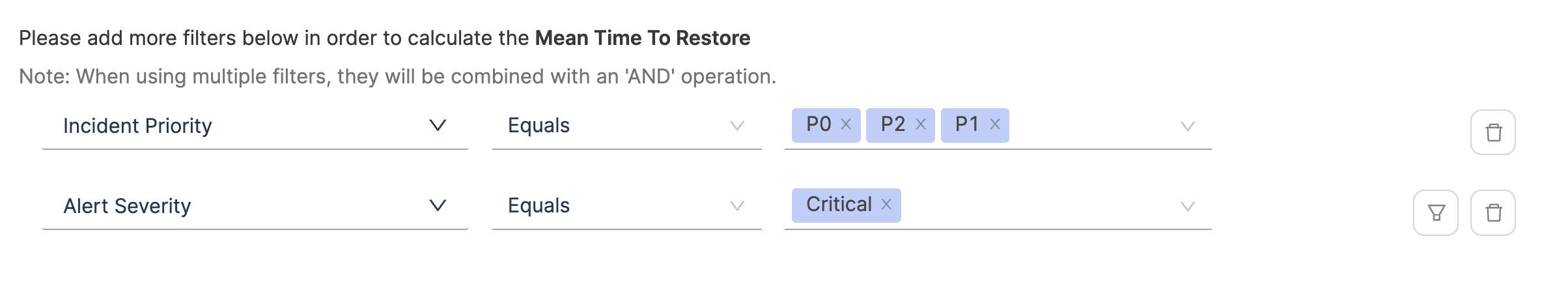 • Define incident criteria for calculating MTTR by selecting various filters that define incidents you want to track or measure for MTTR calculations.
