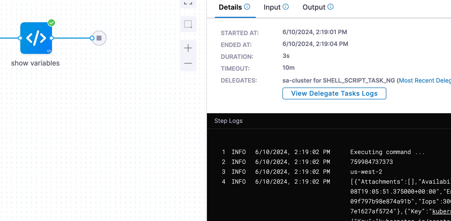Create a new custom stage, and add a shell script step. In the script let's simply print out the variables we just created:
