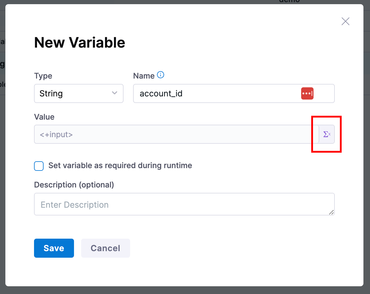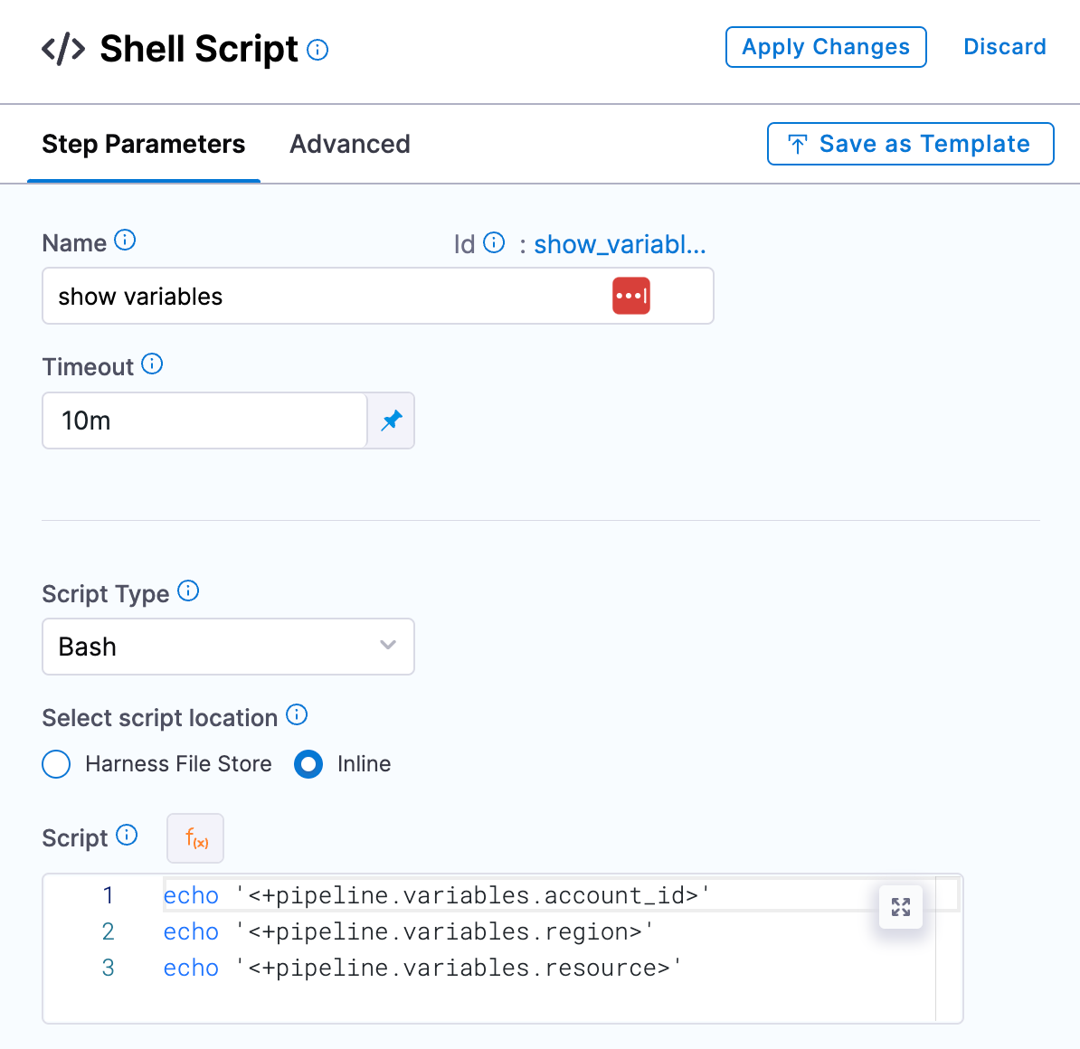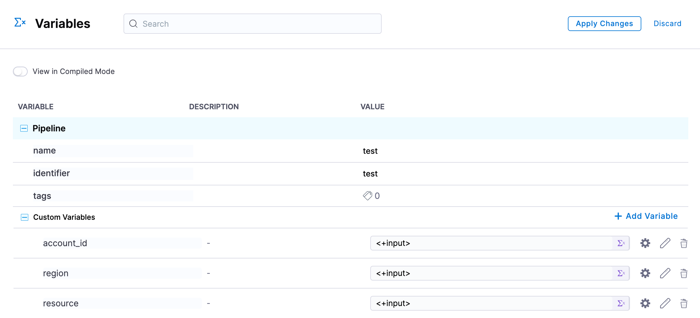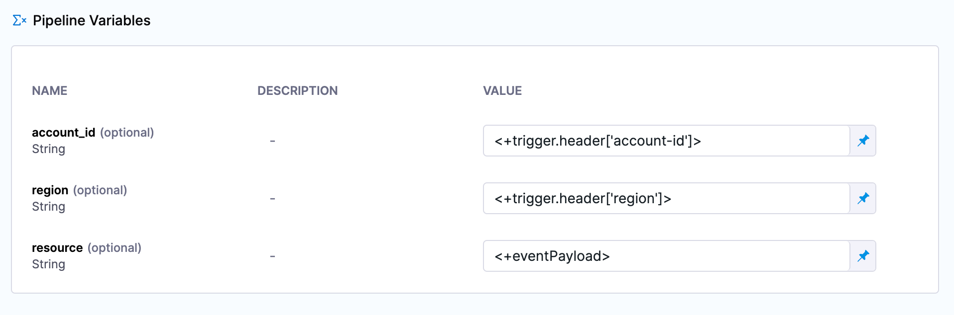 Create a pipeline in some Harness project. On the right hand side select "variables" and under "pipeline" and "custom variables" select "+ Add Variable". Create variables "account_id", "region", and "resource" all of type "runtime input". When creating a variable select the blue checkmark and select the purple "Runtime Input" icon to make it a runtime input.