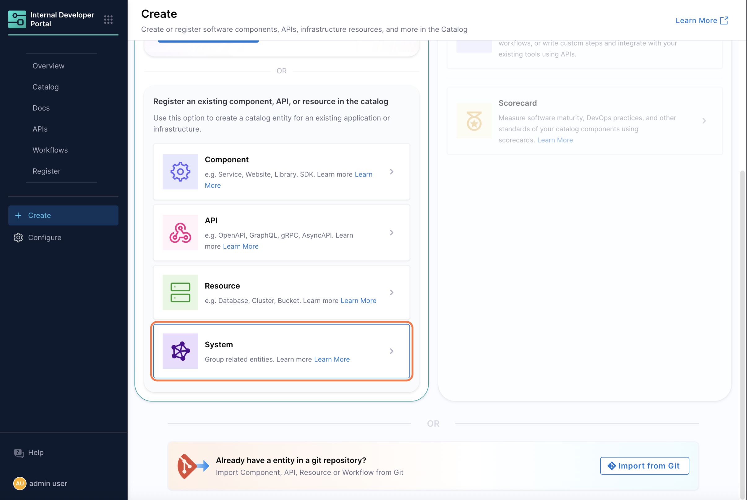 - Define Systems using the IDP UI, YAML, or the Create Entity API (kind: System).