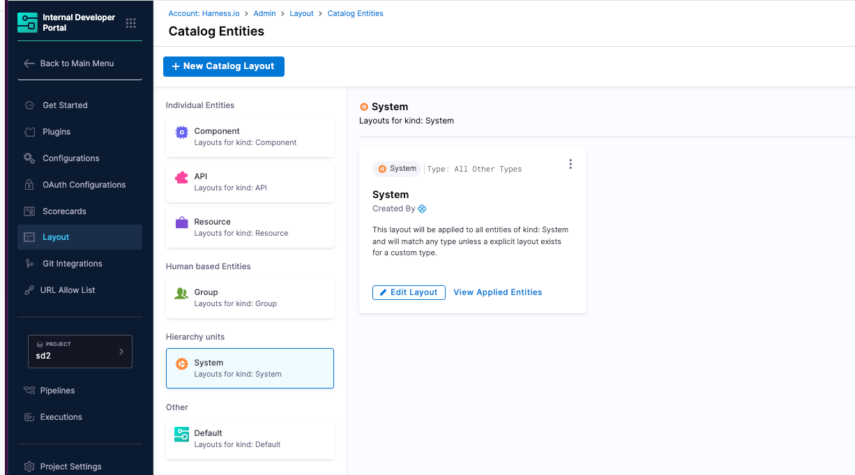 - New default System layout includes tabs for Overview, Entities, Scorecard, and Diagram. Existing customers can apply the provided YAML layout under Admin β Layout β Catalog Entities β System.